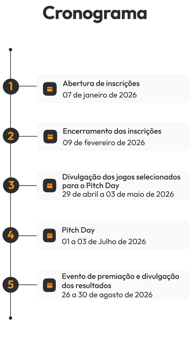 Atenção: Os Jogos Inscritos devem estar completos e lançados comercialmente até o último dia anterior ao início do período de inscrições. Não serão aceitas inscrições de demonstrações, versões de teste (demo), protótipos, versões não finalizadas ou quaisquer produtos que não configurem jogos digitais completos e lançados comercialmente.”